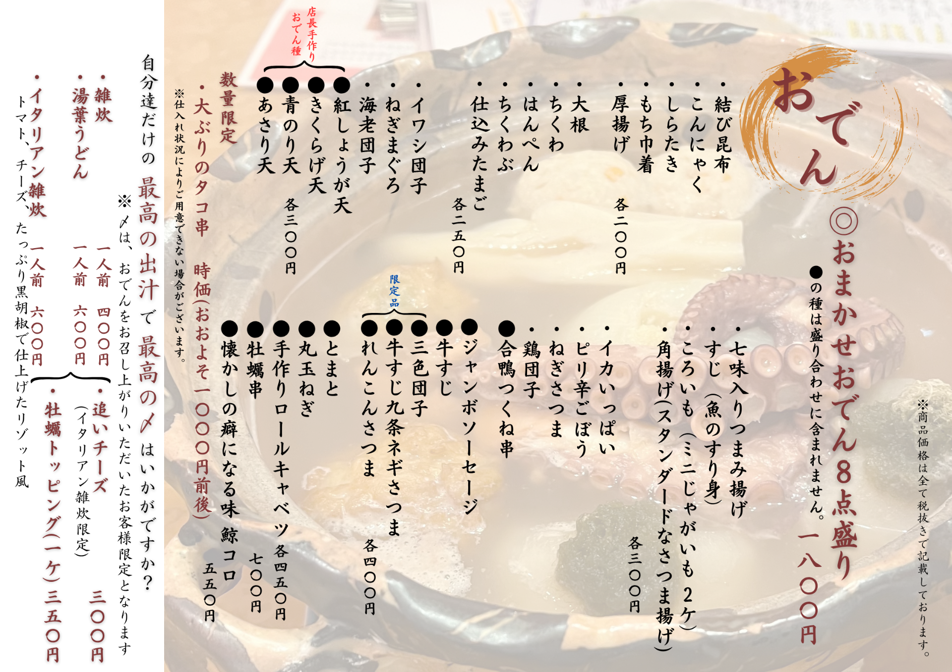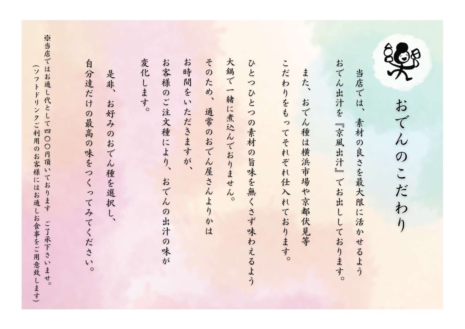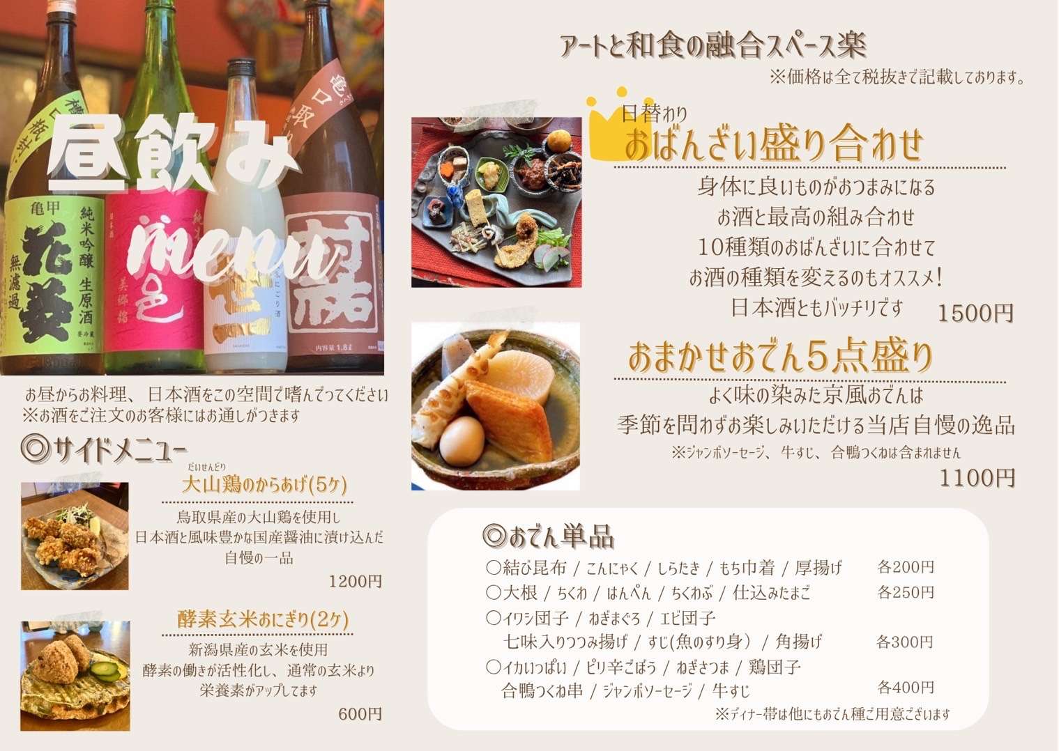 大和市に店舗を構えるおでんバル楽は、大正ロマンを感じられるレトロな雰囲気の中で、安心安全な食材を使ったお料理が味わえるお店として、地元のお客様を中心に高く支持されています。看板メニューのお料理は、肌寒い季節に体を芯から温めてくれる優しい味わいが人気です。一品からお召し上がりいただけますので、量がたくさん食べられないという女性の方でも安心です。夜の営業以外に、ランチタイムでもお召し上がりいただけます。